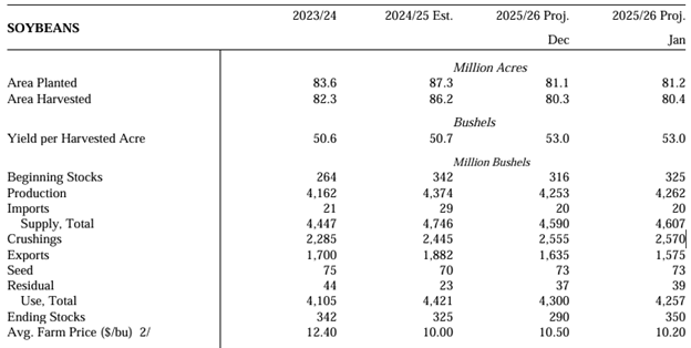 The USDA left the US soybean yield unchanged at 53.0 bpa, which was just below but in line with trade expectations. Like corn, the USDA increased soybean acreage slightly when trade expected it to go down. The result was a 9 million bushel increase to US soybean production, now at 4.262 billion bushels. Soybean crush increased 15 million bushels, while exports were revised 60 million bushels lower. The result was a 60 million bushel increase in soybean ending stocks to 350 million bushels.